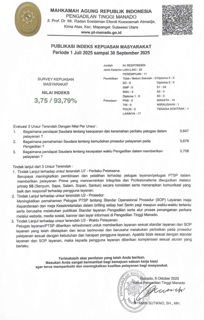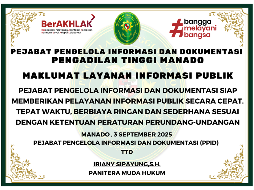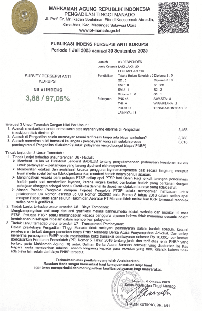Wilayah Hukum Pengadlan Tinggi Manado meliputi seluruh wilayah provinsi Sulawesi Utara terdapat 8 Pengadilan Negeri.