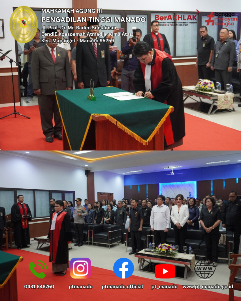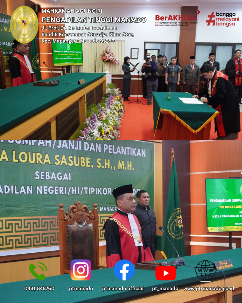 Manado – YM Ketua Pengadilan Tinggi Manado, Amin Sutikno, S.H., M.H., secara resmi melantik dan mengambil sumpah/janji Nova Loura Sasube, S.H., M.H. sebagai Ketua Pengadilan Negeri Manado, pada Rabu (18/2/2026), bertempat di Ruang Sidang Prof. Dr. H. Muhammad Hatta Ali, S.H., M.H., Pengadilan Tinggi Manado.