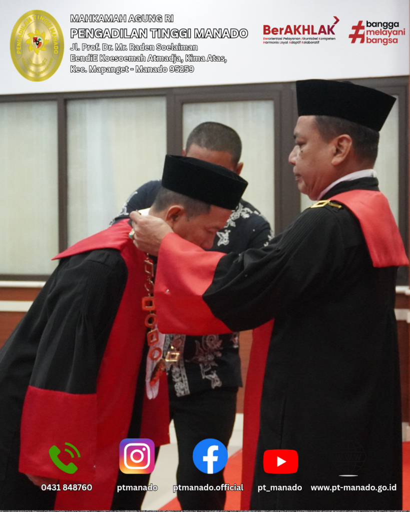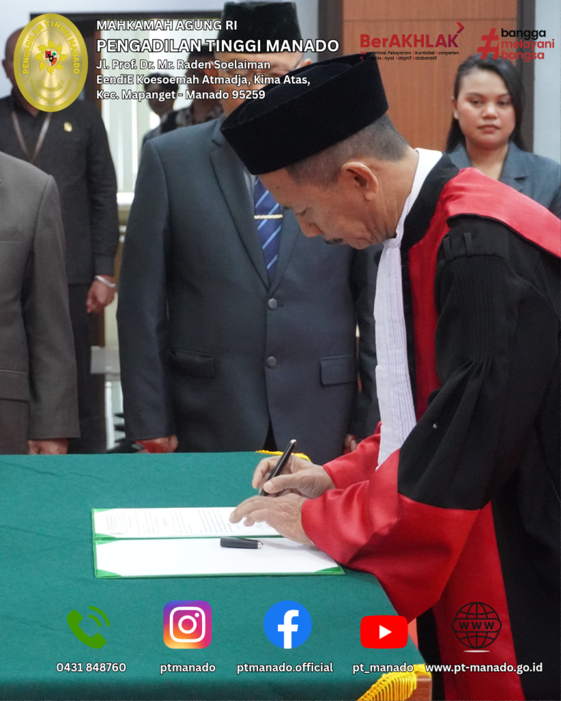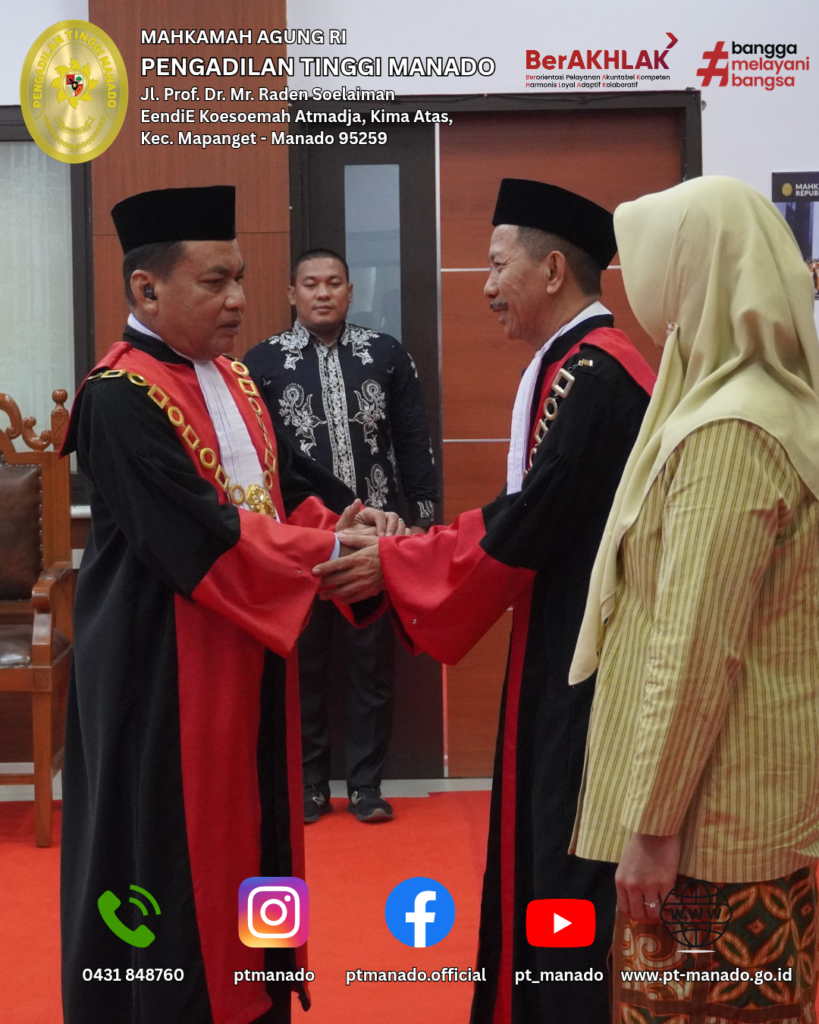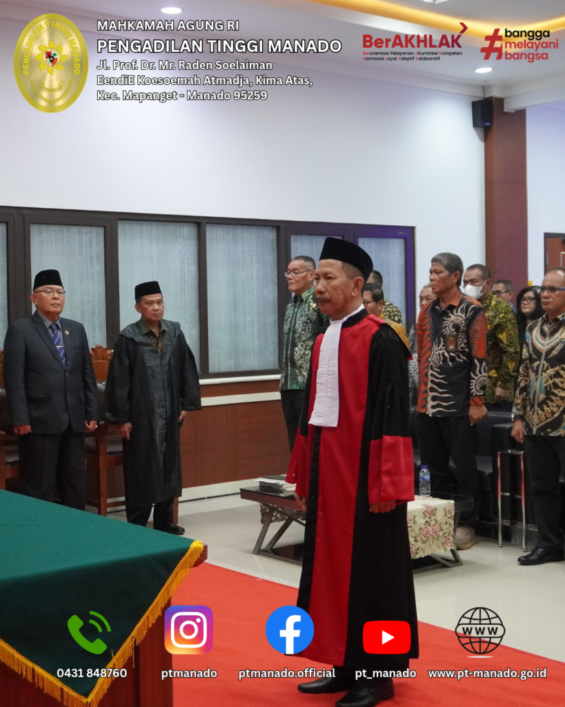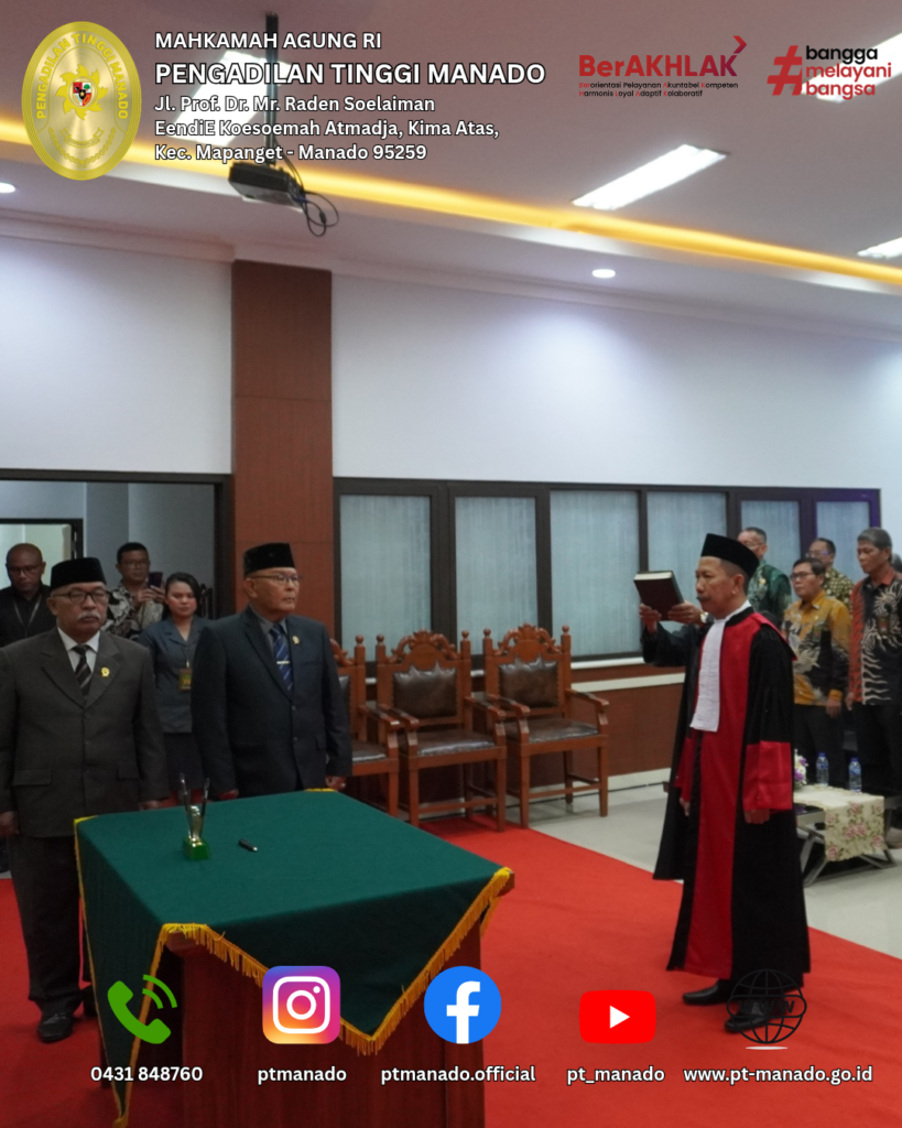 Manado – Pengadilan Tinggi Manado telah melaksanakan kegiatan Pengambilan Sumpah dan Pelantikan Wakil Ketua Pengadilan Tinggi Manado pada Jumat (30/1/2026) bertempat di Ruang Sidang Prof. Dr. H. Muhammad Hatta Ali, S.H., M.H., Pengadilan Tinggi Manado.