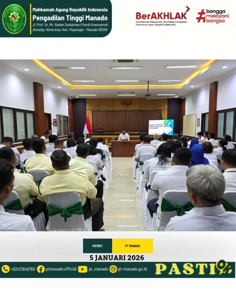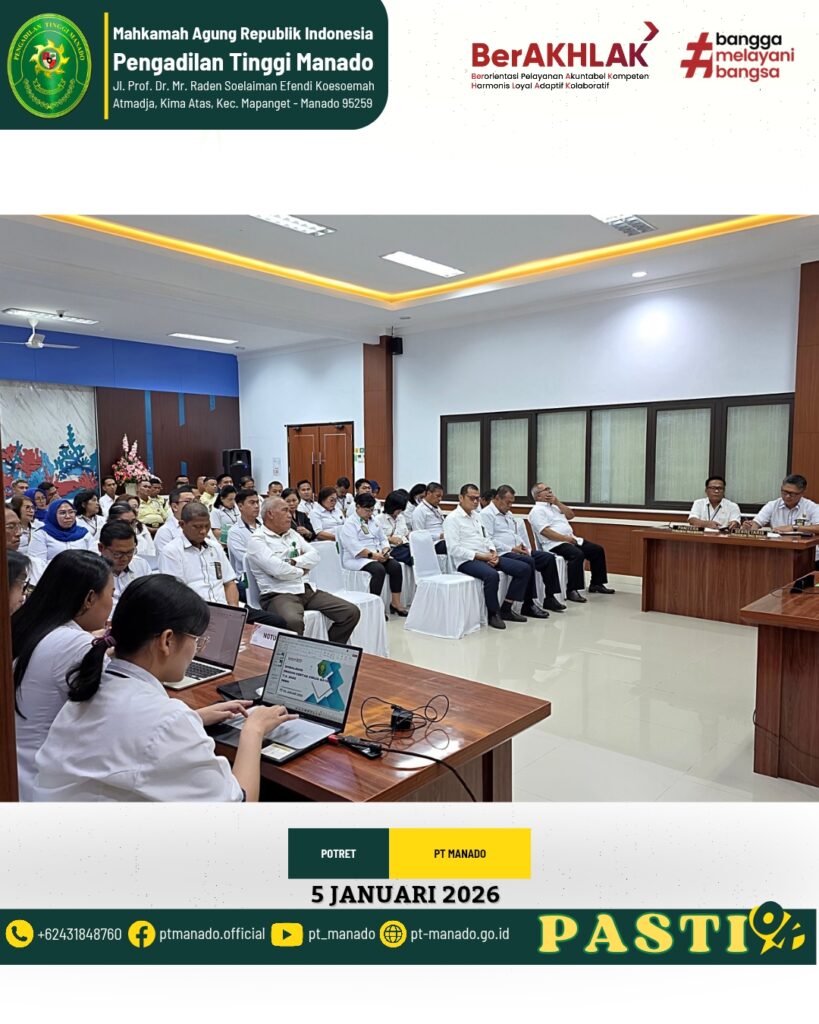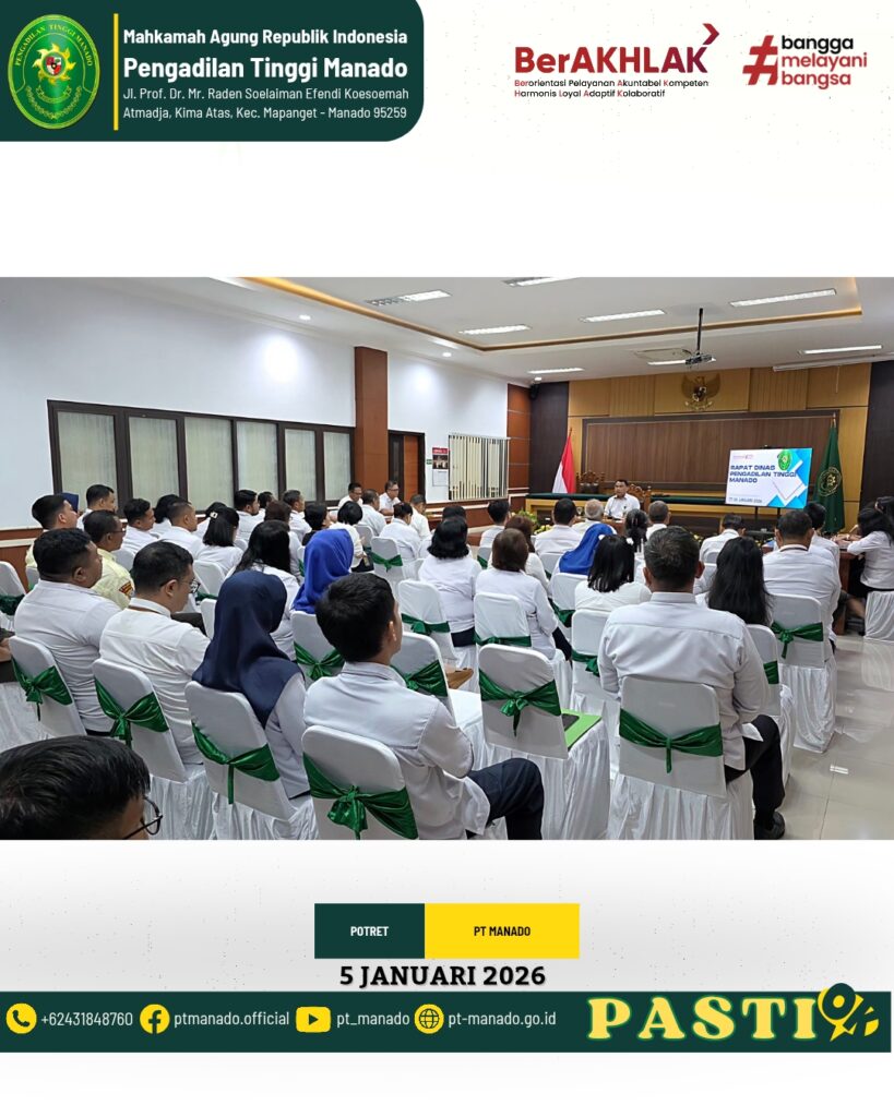 Dalam rangka meningkatkan kinerja dan pelayanan kepada pencari keadilan, Pengadilan Tinggi Manado mengawali kerja di awal masuk kantor tahun2026, tepatnya pada hari senin 5 januari 2026. Rapat ini dipimpin langsung oleh Yang Mulia Ketua Pengadilan Tinggi Manado dan dihadiri Para Hakim Tinggi dan Hakim Ad Hoc Tipikor, Pejabat Struktural dan Fungsional serta Karyawan dan Karyawati.