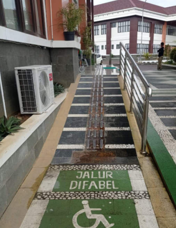 Adanya jalur landai didua sisi pintu masuk Kantor Pengadilan Tinggi Manado, bertujuan untuk memudahkan penyandang disabilitas yang kesulitan menggunakan anak tangga.