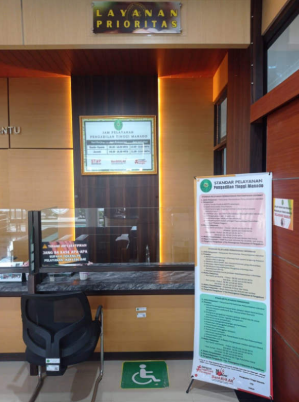 Terdapat kursi prioritas sebagai tempat khusus untuk penyandang disabilitas dalam menunggu pelayanan pada Kantor Pengadilan Tinggi Manado.