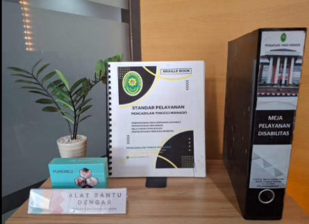 Tersedia buku panduan Standar Pelayanan pada Pengadilan Tinggi Manado dalam bentuk buku Braile bagi penyandang disabilitas tunanetra, yang berisi sesuai dengan pelayanan yang ada pada Pengadilan Tinggi Manado
