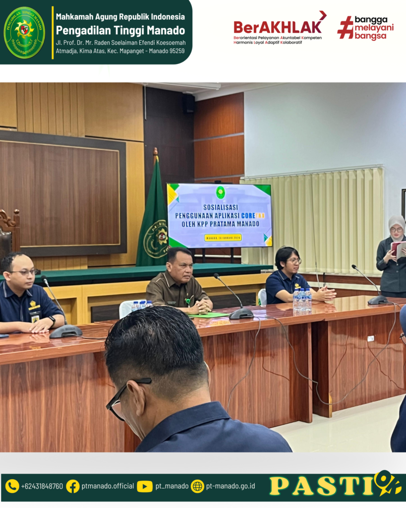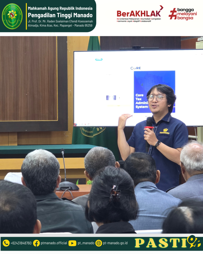Rabu, 14 Januari 2026 KPP Pratama Manado Mengadakan Sosialisasi dan Pengenalan tentang Coretax yang dilaksanakan di ruangan serba guna Pengadilan Tinggi Manado. Setelah kegiatan sosialisasi selesai, KPP Pratama Manado dalam hal ini diwakili oleh beberapa staf, membuka loket pelayanan bagi warga Pengadilan yang mengalami masalah dalam mendaftar atau konsultasi cara penggunaan Coretax dan hal lain yang berhubungan dengan pajak.