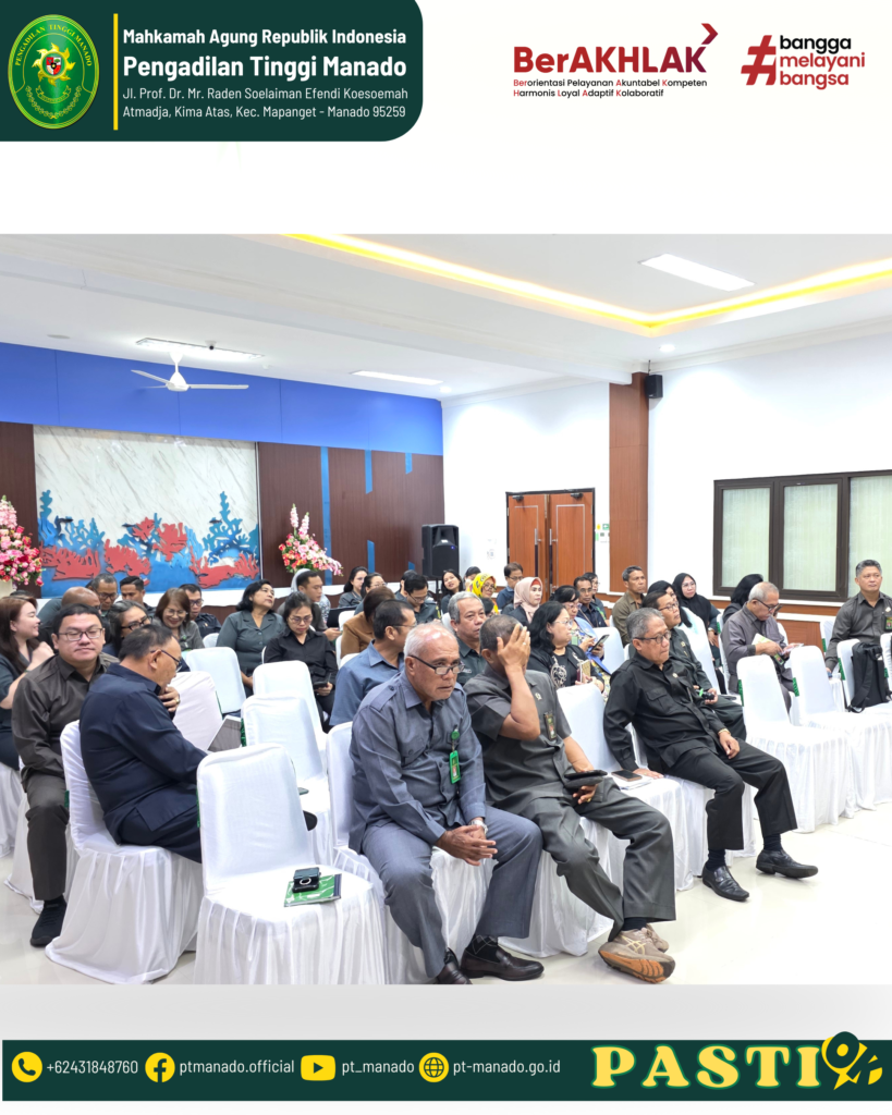 Pada kegiatan ini dihadiri Langsung oleh Yang Mulia Ketua Pengadilan Tinggi Manado, Hakim Tinggi dan Hakim Ad Hoc Tipikor, Pejabat Struktural dan Fungsional, serta Karyawan dan Karyawati Pengadilan Tinggi Manado.